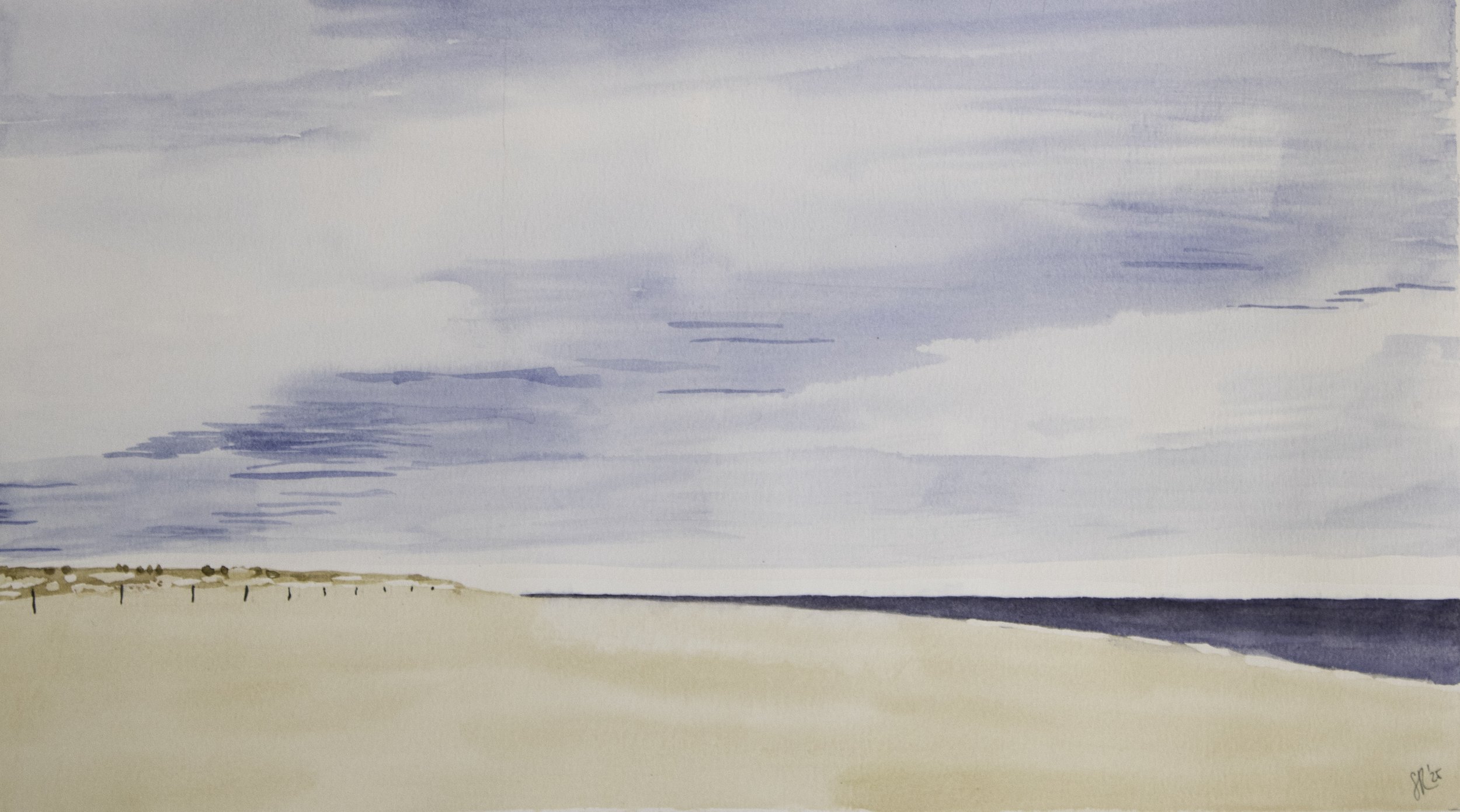 This watercolor focuses on a quiet coastal scene using soft washes and minimal detail. The composition emphasizes open space and the relationship between sand, sea, and sky. Subtle tonal shifts create a calm atmosphere, while the distant shoreline adds a sense of scale and context.